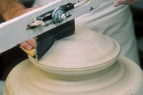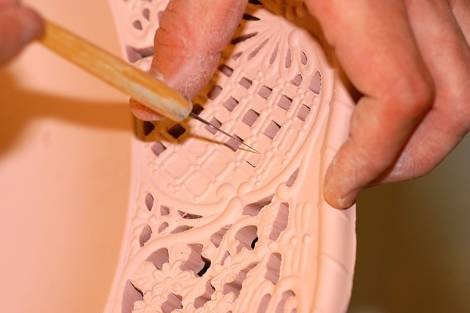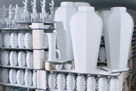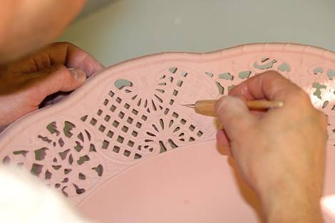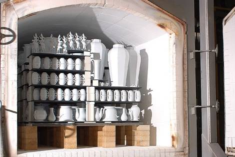 Szakértő kezek készítik elő a nyers porcelántárgyakat az első égetésre, amely kb. 950ºC-on történik